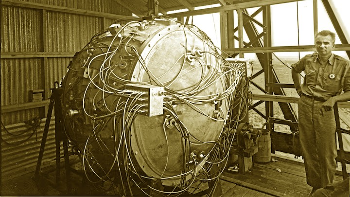 La 1ère bombe atomique au plutonium est expérimentée (Trinity Test) dans le désert du Nouveau-Mexique, près de la base aérienne d'Alamogordo. L'explosion, équivalente à 15k tonnes de TNT, est visible à 300km à la ronde.